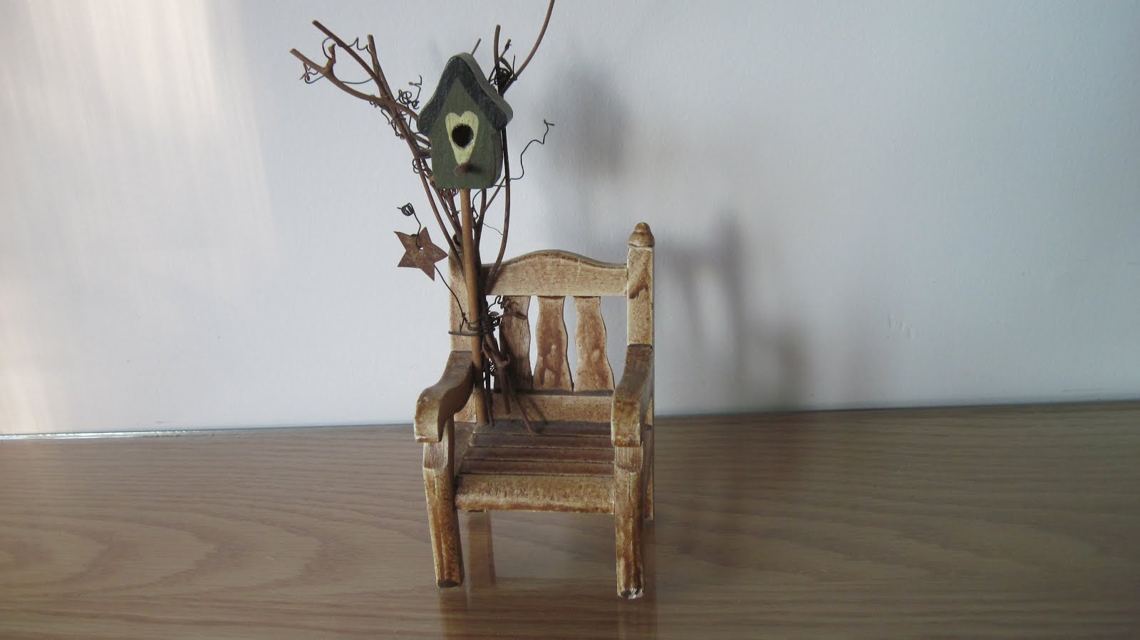 It's a simple garden chair made of some sort of dense plastic, with a bunch of grape vine twigs and tendrils, a rusty tin star, and a little birdhouse. The little vignette is very close if not exactly 1/12 scale. I knew what I wanted to do with it right away. Here is step one of the transformation process:
