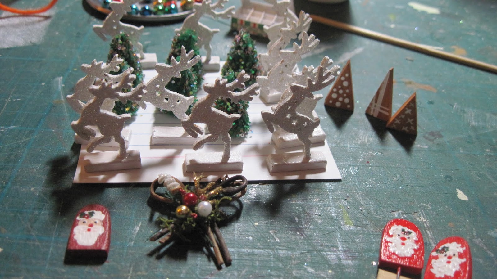 I've been working, slowly, on creating some more stock for my Christmas stall. The tiny green Christmas trees are made from chenille sticks and glitter, while the brown and white wooden ones were inspired by a Scandinavian Christmas ornament site. The leaping deer, two different kinds, are inexpensive laser cut ornaments from the $store, painted white, mounted on bases, and then dressed up with micro-glitter in white. Some of these will go into the stall, while others will go into my shop in a box, for whenever we are able to have or visit miniature shows again....