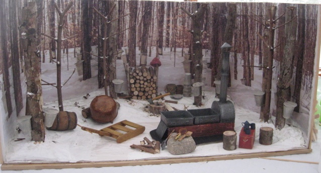 On the other side, the sap boilers are finishing their tea break, using the chest they employ to haul the necessary tools and equipment into the woods as their table. On the stump is a hydrometer in its case, while the sieve, skimmer and scraper are on top of the rock. The small shovel for the ashes leans against the rock. The fireplace was built of commercial miniature bricks, while the pans, smoke hood and damper are made of faux-finished cardboard.